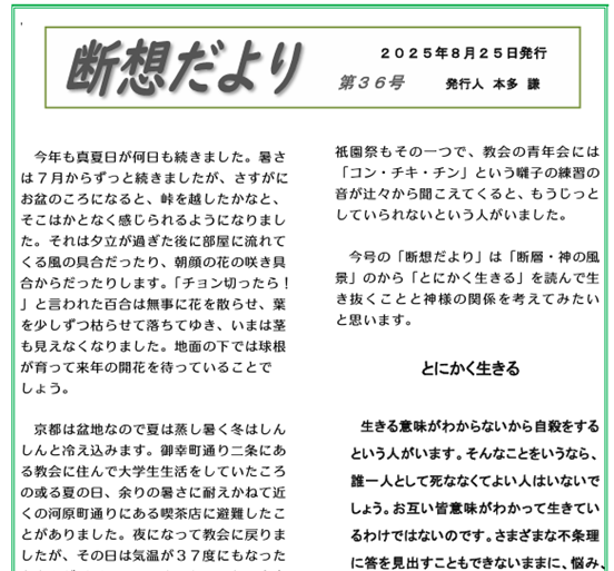 10月の聖書輪読会は10月30日(木)20時からです。 第一コリント12章をともに読みましょう。今村あずさ牧師がリーダーです。自宅にいてネットで信仰の仲間とゆったり話し合いできる場をどうぞご利用ください。歳をとって外歩きが難しくなった人にお奨めです。 l 「断想だより」32号(2024年12月22日発行)を読むにはココをクリック。 l 「『かみさま』と呼ばれた男 陸軍野戦気象班中尉 宮之原和人の最後」 に穂積夏子さんからの手紙を加えました。(2024/8/4) 「断想だより」を読んでみたい方は support@ekyoukai.org までメールください。無料で一部お送りします。 藤木牧師のビデオ(NHK放送、礼拝録画)をお分けします。support@ekyoukai.orgまでご連絡ください。 l