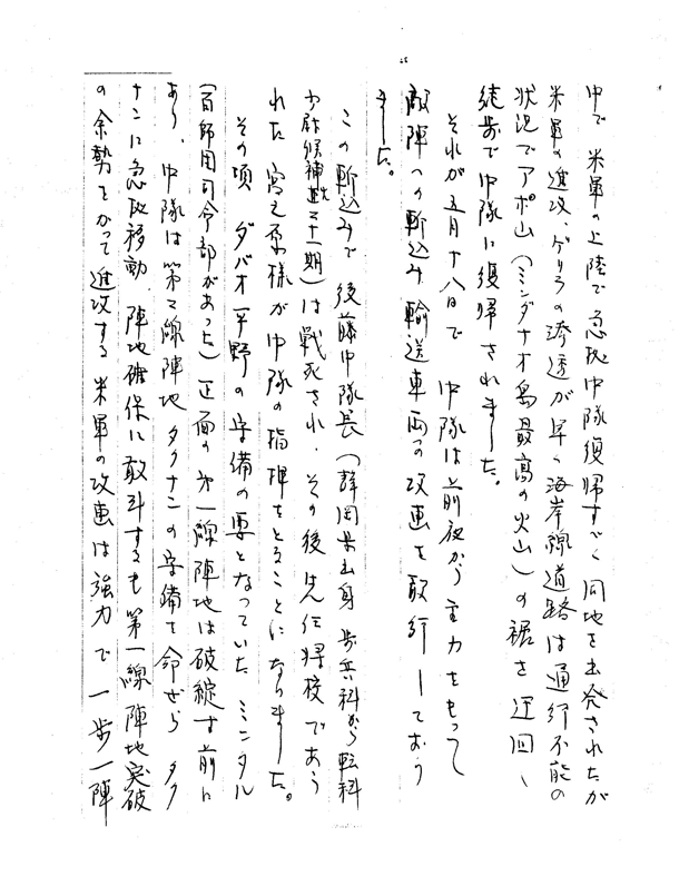 以下は宮之原和人さんが兄の右近さんの消息を尋ねた手紙を今村氏に送り、その返答の手紙です。今村氏は右近さんの第二十二野戦気象隊に所属していました。 拝復 お手紙拝見致しました。 今年も余す所ところ僅となり、寒さも一段と厳しさを増してまいりましたが、お元気でお過しの由およろこび申し上げます。 お手紙を受取り差出人が 宮之原和人様となっておりましたのですぐに、宮之原中隊長様の関係のお方ではと直感し早速開封し拝見致した次第です。 このようなお手紙をいただく前に当方からお知らせを差上げるべきでしたが、何分にも戦後の混乱と資料不足で関係される方々の住所等も判明せず、戦後三十年過ぎた時に伯野廣次様から中隊の戦没者、生存者名簿を入手致しましたが、その時点では行政区域の変更やら世代の交代など、あまりにも時がたち過ぎており、関係者の所在を探すのに尚、困難な状勢となっていた次第ですが、私も年をとり何んとか自分の歩いた人生を記録しておきたいと思い、人生で一番強烈に印象に」残っている戦争体験からとはじめたのが別冊のようなものでございます。 私は 昭和十八年志集の現役兵で、昭和十七年四月開隊した第一気象 当時、中隊兵舎にはラサンからダリヤオンに移籍したばかりで、椰子林の中に中隊事務室 、炊事、経兵所、車庫、各班兵舎のニッパハウスが点在しておりました。 予報班の兵舎には宮之原様、小隊長楢崎健夫少尉(復員したが昭和五十年に病没と判明)等下士官、兵共に同居しておりました。 軍隊といっても当時の内務班の雰囲気は家庭的な集団で、私達初年兵にとってはよい内務班でした。 気象業務の余暇にはバナナ、パパイアなど野菜や果物収集、海岸で漁,製塩、製油(ヤシ油)作業をしたり、水際陣地の構築などをしており、米軍がレイテ島に上陸する前ころから飛行場に対する空爆が強化され、穴のあいた滑走路の補修作業に動員されましたが、飛行機(日本)が来なくなり作業もなくなりました。 昭和二十年四月、米軍がコタバトに上陸した時には師団命令により水際陣地を放棄し、中隊本部はダリヤオンからマナンプランに移動してバンカスに陣地を構築中でした。 宮之原様は二十年三月中旬頃からパタダ(デゴス)の南に出張中で、米軍の上陸で急遽中隊復帰すべく同地を出発されたが、米軍の侵攻、ゲリラの浸透が早く海岸線道路は通行不能の状況でアポ山(ミンダナオ島最高の火山)の裾を迂回し徒歩で中隊に復帰されました。 それが五月十八日で、中隊は前夜から主力をもって敵陣への斬込み、輸送車両への攻撃を敢行しておりました。 この斬込みで後藤中隊長(静岡県出身、歩兵科から転科、少尉候補第二十一期)は戦死され、その後先任将校であられた宮之原様が中隊の指揮をとることになりました。 その頃、ダバオ平野の守備の要となっていたミニタル(百師団司令部があった)正面の第一線陣地は破綻寸前にあり、中隊は第二線陣地タクナンの守備を命ぜられ、タクナンに急遽移動。陣地確保に敢斗するも第一線突破の余勢をかって進攻する米軍の攻撃は強力で、一歩一陣と後退を余儀なくされ、米軍と接触し乍らの後退で、一番犠牲者を出し、苦戦の時期でした。 宮之原様もカリヤオ高地を占領中の六月十六日米軍の戦闘爆撃機の攻撃を受け、頭部に爆弾破片創負傷をされ海軍病院に収容されました。 七月四日一応中隊復帰はされましたが、受傷部位は完治しておらず、中隊付衛生班長牧田軍曹が治療を続けておりました。 七月中旬、中隊は最後の拠点となった翼山陣地に転じ、そこで陣地守備と自活の体制に入りました。 この頃米軍も組織的な攻撃は仕掛けてこなくなり、時折ゲリラの攻撃程度でした。 又当時の中隊の体制は健常者は殆どなく、とにかく朝動ける者がその日の勤務にあたるよいった状況でした。 私は 六月中旬頃から衛生班(下士官に兵士)の補助を命ぜられ負傷者、病者の搬送、給与一切を衛生兵二人で担当していました。これらの負傷者、病者も薬がないため倒れたものを寝かせておくだけで、再起できず次々と亡くなっていきました。 七月中旬翼山陣地到着後は前記の戦況で落付いてまいったので医務室補助を解除され陣地復帰となり、同時に中隊長当番を命ぜられました。 宮之原様は負傷、マラリヤ発病、それに食料不足で大変衰弱しておられましたが、食事と言っても米なく粗末な雑炊でしたが何時もお美味しいの連発で召し上がってくれました。あの時のお顔は今でも眼底深く焼付いております。 私も八月十日頃遂にマラリヤで倒れ入室してしまい。 宮之原様の亡くなられた時の状況は詳しくはわかりませんが前記の様な状況でベッドに寝たり坐ったりの状態でした。 終戦後は、ラサン飛行場で武装解除され、ダリヤオンPW収容所に収容され、十一月二十五日に復員(浦賀)しました。 さきにもふれましたが昭和五十二年五月になって当時の庶務、兵器班長 伯野廣次様(住所)にお逢いする機会があり伺
