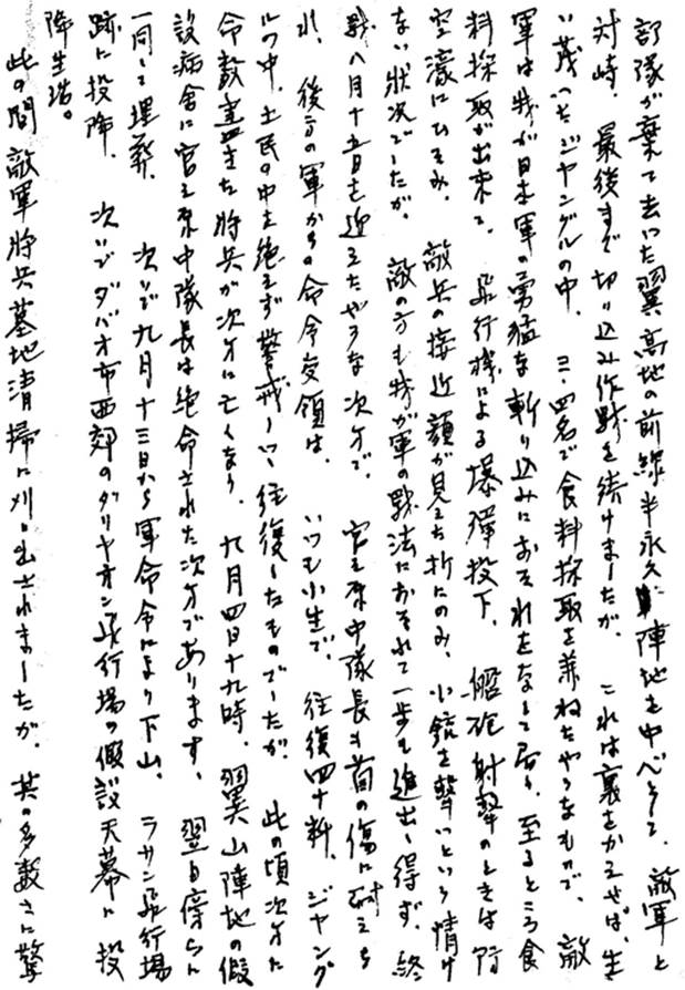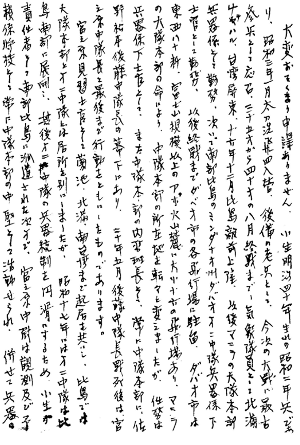 以下は伯野廣次氏が宮之原右近さんの弟和人さんにあてた手紙です。伯野氏は右近さんの部下としてフィリピン戦線で右近さんと最後まで一緒に戦いました。伯野氏は和人さんの求めに応じ、右近さんの最後の模様を教えて下さいました。 大変おそくなり申譯ありません。 小生明治四十年生まれの昭和二年兵であり、昭和三年一月太刀洗飛四入管。後備の老兵として、今次の大戦に最古参兵として応召。三十五才から四十才の八月終戦まで、気象隊員として北満チチハル、台湾 宮之原見習士官として ダバオ市は東西八十粁近く、在留邦人二万余あり、マニラ麻や農産加工に従事し、また山口県人も多数あり、是等の邦人は終戦近くになり、次第に住居地域や生活も狭まり、軍に協力の命令あり、近くの部隊に編入されましたところ、後藤中隊長宮之原中尉の許可を得て、気象中隊に多数編入。併せて食料の増産に従事させ、軽度の病気治療には中隊衛生兵に初度の医薬を与えて信頼されて居りました。 軍司令部に再三宮之原中尉と共に、命令受領または兵器物品受領に行きましたが、その都度飛行機よりの爆弾投下、機銃掃射を受けた際は、邦人のタコ壺にかくれ潜み、その掃射の終るを待ち、終了後隣のタコ壺に宮之原中尉如何ですかと声をかけますと、何時も小型の聖書を手にして居られ、平時と変らない状態でした。 比島レイテに米軍上陸。比島は南北に分断せられ、二十年四月下旬から米豪軍のダバオ攻撃あり。次第にダバオ東西八十粁の戦線は西から東へと攻め立てられ、当時一番右翼の西にあった気象第二中隊は、かねてから埋設した陣地も、科学兵器の前にはあっけなく撃破せられ、全軍あげての反撃中、五月十八日後藤中隊長壮烈な戦死あり。以後主任将校であった宮之原中尉を長として、アポ火山中腹を転々として東へ移動し乍ら交戦を続けました次第。 ダバオ湾上からの艦砲射撃、飛行機による爆弾投下、機銃掃射あり。加えて熱帯病であるマラリアがあり絶えず悩まされ、食料は山野で各自採取。続々と戦死または病没して、全く明日の身が知れない状況下でありました。 小生は佐賀県有田の陶器製産販売の商家八人兄弟の中に生まれ、幼少より貧しく耐乏生活になれ、山口県の親族をついだ者ですが、現役中は二ヶ年保護兵として激務を禁じられて居りましたが、比島上陸後は一番先きにマラリヤ、デング熱にかかり、四年比島生活後半のころは若年免疫したものか、後続入隊した将兵が、各種の熱病にかかって苦しんで居ります頃は、小生割合に壮健で、いつも後藤宮之原亮中隊長の傍らにあり、戦闘指揮班長として百五十余の残る兵の中堅となって、後退作戦を練り、特に宮之原中隊長から、たほれゆく将兵を、手厚く埋葬してやれと、絶えず言はれ、その都度観音経を読んで埋葬し、遺髪は全て封筒におさめて居りましたので、一部のものの遺品も収めて持ち帰って、終戦後二十一年六月頃迄に、東北を除く鹿児島、熊本、宮崎、大分、福岡、ナガサキ、山口、島根、鳥取、岡山、愛媛、高知、香川、愛知、静岡、東京、埼玉、群馬、栃木、三重県と各将兵戦友宅を自費で廻り、戦没されました状況を御報告申し上げ、または公式葬儀の際は再度訪ね,隊長に代って弔辞を述べました次第です。 宮之原中尉の最後は、二十年六月十六日、ダバオ市の北部長峰高地にて他の下士官兵七名爆撃戦死の際、首の背後に爆傷を受けられ、七八月の後退に苦るしみに耐えつつ中隊を指揮、ダバオ市の全軍将兵、次第に追い立てられましたが、殆どマラリヤや熱病赤痢に苦しみ、餓死するものも続出、上官一同合議の上、歩兵部隊が棄て去った翼高地の前線半永久陣地を中心として、敵軍と対峙、最後まで切り込み作戦を続けましたが、これは裏をかえせば、生い茂ったジャングルの中、三、四名で食料採取を兼ねたやうなもので、敵軍は我が日本軍の勇猛な斬り込みにおそれをなして居り、至るところ食料採取ができる。飛行機による爆弾投下、艦砲射撃のときは防空壕にひそみ、敵兵の接近顔が見えた折にのみ、小銃を撃つという情けない状況でしたが、敵の方もわが軍の戦法におそれて一歩も追い出し得ず、終戦八月十五日を迎えた様な次第で。宮之原中隊長も首の傷に耐えられ、後方の軍からの命令受領は、いつも小生で、往復四十粁、ジャングルの中、土民の中を絶えず警戒しつつ往復したものでしたが、此の頃次第に命運尽きた将兵が次第に亡くなり、九月四日十九時、翼山陣地の仮設病舎に宮之原中隊長は絶命された次第であります。翌日傍らに一同して埋葬。 次いで九月十三日から軍命令により下山。ラサン飛行場跡に投降。次いでダバオ市西郊のダリヤオン飛行場の仮設天幕に投降生活。 この間敵軍将兵墓地清掃に刈り出されましたが、其の多数さに驚くと同時に、斃れた我が軍将兵も、さぞや安んじて瞑目したことであろうと話し合ったものです。 十一月七日ダバオ出発。十一月十七日神奈川県