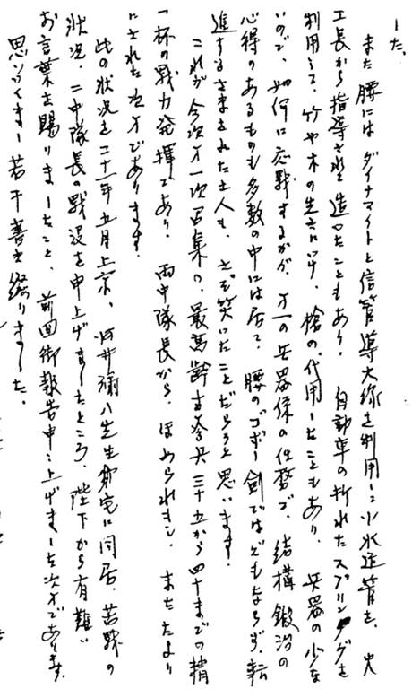 以下は伯野廣次が宮之原和人さんに宛てた第2の書簡です。日付が昭和61(1986)年3月15日となっています。 第一の書簡の日付が昭和61年2月18日ですから、和人さんは2月に伯野氏から書簡を受取り、早速菓子を添えて礼状を送、それに対して伯野氏が返礼したのがこの書状になるでしょう。 拝復 過日は御丁重な御返事、また結構な仙台銘菓の御送付を賜り、有難くいただきました。心から御礼申し上げます。少しく原稿の〆切りに追はれ御返事がおくれました次第、何卒御海容下さい。 同封の福岡県袋井市の今村兼次君と、愛知県幸田町の杉田君の来信がありましたので、併せて御覧下さい。共に昭和十九年十二月ごろ、ダバオ市東部ラサンに分駐しました。加藤少尉野田軍曹以下の小隊で、前中期の交戦なく、次第にダバオ西地区から撃破された中隊本部にくらべ、全員元気旺盛でしたが、合流以降は主戦力となり、翼山陣地で悪戦苦闘。野田軍曹は、小生昭和三年太刀注飛四時代の古参戦友であり(戦史二一七頁)今村君は戦後警察官となり警視として静岡県内各署をまわり、最近退職。杉田君は自営業として雑貨商、トヨタ自動車の拡張につぐ拡張、周辺都市の発達で好況の様子。横須賀上陸後、小田原の次に尋ねた沼津の藤井六郎君と今村君など最後の召集兵で、みんな後藤中隊長宮之原中尉のもとに、よく一致して従軍苦斗してくれたものでしたが、二一五頁のKの如き山口鴻城中学卒業後、野気二中隊幹部となり、どこから情報を得たか、軍重要文書を持にげて、投降したらしく、戦後韓国軍の中堅となった様子。 また負傷、マラリヤなどで作戦地を避けまわり、保身につとめ、八月十五日の終戦後、ようやく中隊を尋ね来たやうなものも多数あり。残る多数の若い兵士諸君は五月十八日後藤中隊長戦死後は、先任「宮之原中隊」として一致団結。再三危難を乗り越えて、アポ火山麓の戦線を、西から東へと転々として応戦し乍ら移動しましたが、これは宮之原中隊長の神のやうな私心のない指揮統率によるもので、「よくやって呉れた手厚く埋葬してやれ」と、絶えず言われ、小生所持の小型の「観音経」を、二一九頁の松本智 宮之原中隊長の廃部の負傷も、医薬品も少なくなり、「赤チン」程度。軍医も出先の中隊には居ず、死なせずにすんだ多数の将兵に、毎日「まなこ」を閉じ手を合はせるのみでした。 で横須賀浦賀上陸。浦賀は嘉永六年六月米艦ぺリーの上陸した旧跡で、戦勝米軍ながら「あっぱれ」で、以降重砲兵隊舎で解散帰郷。東北を除く全国各地の将兵遺族宅に参上。敗戦状況を詳細ご報告申上げ、涙のうちにも、よく聞いてくださいまして、現在でも出征兵士で戦没地や、状況が不明の方が多くあるなかで、よいことをしたと所存しております。これひとえに、後藤中隊長と敵陣斬込み最後の一夜を、枕を並べて寝にいきましたが、たがいに今夜が最後とは考えながらも、最善を皇国のためつくすといふ点には変りはなく、夜あけと共に最後の朝食もそこそこに、各分隊指示通りに前線に斬り込みました次第。 宮之原中尉は此のとき、更に西方の陣地にあった分隊の引上げ退去の連絡のため不在。米軍急進撃の戦線をくぐり抜けて、遠くアポ火山の中腹を廻りまわって、隊長戦死直後帰隊されました。 これ以降は前回に書きました通りで、気象隊第二中隊戦史に見える通りで、火器は全くなく、十六年十月台湾高雄乗船の際に一ヶ大隊4五十余人に対し、小銃三十丁、弾薬一丁に対し六十発宛を強制的に入手し、これを大隊本部と第二中隊に十五丁宛配分。これがただ一 また腰にはダイナマイトと信管導大線を利用して小水道管を、火工長から指導されて造ったこともあり、自動車の折れたスプリングを利用して竹や木の生 これが今次第一次召集の最高幹古参兵三十五から四十までの精一杯の戦力発揮であり、両中隊長から、ほめられもし、また たよりにされた次第であります。 此の状況を二十一年五月上京、河井彌八先生宅に同居、苦戦の状況,二中隊長の戦没を申上げましたところ、陛下から有難いお言葉を賜りましたこと、前回ご報告申し上げました次第であります。 思いつくまま若干書き綴りました。 また次回に平素の生活、沖縄に米軍上陸して、内地に生きて帰えるのぞみを失った将兵は、どんな生活をしていたか、書きまとめてみたいと思いますが、身辺多事であり、今次は是で筆を止めます。 昭和六十一年三月十五日 不一 伯野廣次 拝 宮之原和人様 侍史 注;上記は手書きの文面を文字入力したものです。文体、送り仮名等は出来るだけ原文のままに留めましたが、句読点を適宜加えてあります。難読文字にはその文字の複写を挿入しました。私の誤読が無いとは言えませんので、以下の複写を参考にご覧ください。 |