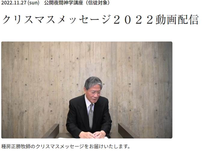 をクリックしてください。 2022年東京神学大学公開講座クリスマス祝会はコロナの蔓延の為開かず、代りに東京神学大学のホームページ上に説教ビデオを掲載することになりました。説教者は種房正勝牧師(66期)です。種房牧師の説教ビデオのページは以下の画像をクリックしてください。 7.ビデオ会議「言いたい会」を11月19日(土)18時から開きました。 総勢6吊の方が「言いたい会」に集まり、1時間半ほど勝手なことを言い合いました。とはいっても内容は真剣で、癌の告知を受けたけどこれからどう生きようか、などでした。個人がバラバラになっている現代、自宅に居ながら、時間の制約を受けずに、自由に自分の事を言い合い得た時間は貴重でした。次回は12月27日(月)くらいになるかも知れません。もっと多くの方に参加して頂きたいです。 以下は今回の「言いたい会」に参加された多田勝治さんの教会紹介です; 2022年11月13日主日礼拝(第三礼拝11:00~) ウクライナ支援特別礼拝を持ちました。 オクサ*ナ・ステパニュックさんの特別賛美。他 You