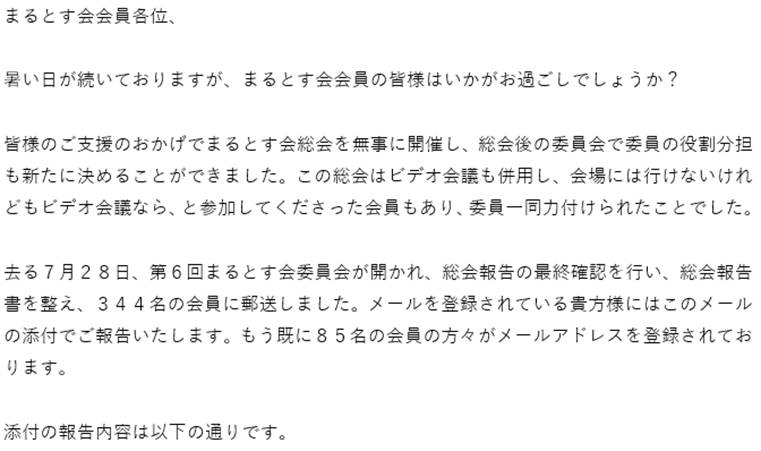以上です。なお、新委員長ご挨拶はここをクリック (ア) メルアド登録のお願い(メルアドを既に登録頂いた方は見逃してください。) マルトス会役員会(事務局)は郵送などの費用を節約し、会員皆様との連絡を円滑にするためにメールを活用することにしました。従来は役員会からのお知らせなどは郵便でお送りしていましたが、メールアドレスを登録して頂いた方にはメールでお送りし、お持ちでない方には従来通り郵便でお送りしたいと思います。近年ほとんどの方が電子メールをお使いなので、こうした変更はご無理ではないのではないかと存じます。 従いまして、貴方様のメールアドレスから maltos@ekyoukai.org までその旨のメールをお送り頂ければと存じます。もしお子様やお孫様が代わりにメールを受け取って頂けるなら、お子様やお孫様などのメールアドレスをお使い頂いても結構です。 なお、この様に致しますと、会員相互間の交流が促されるメリットもあろうかと存じます。もし他の会員に広く伝えたい事があってそれを